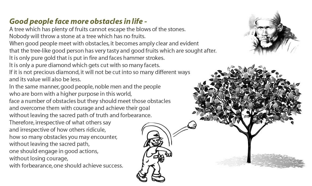 When good people meet with the obstacles, it becomes amply clear and evident that the tree-like person has very tasty and good fruits which are sought after. It is only pure gold that is put in the fire and faces hammer strokes. It is only a pure diamond which gets cut with so many facets. If it is not a precious diamond, it will not be cut in so many different ways and its value will also be less.